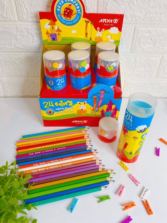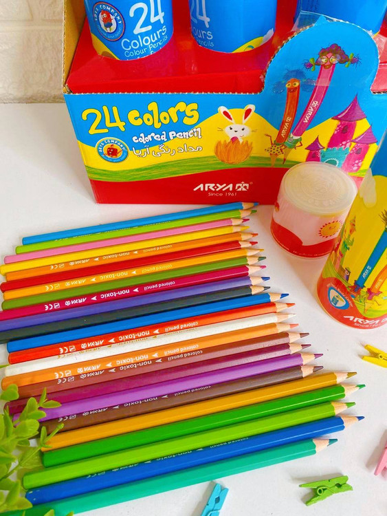 مداد رنگی ۲۴ رنگ از برند عالی آریا🍃جعبه استوانه ای که راحت قابل حمل هست و گم یا شکسته نمیشه🤌چوب مرغوب نوک مقاوم و پیگمنت بالا و کاملا پررنگ و نرم🍓مناسب دانش اموزان مهد و دبستان به بالا